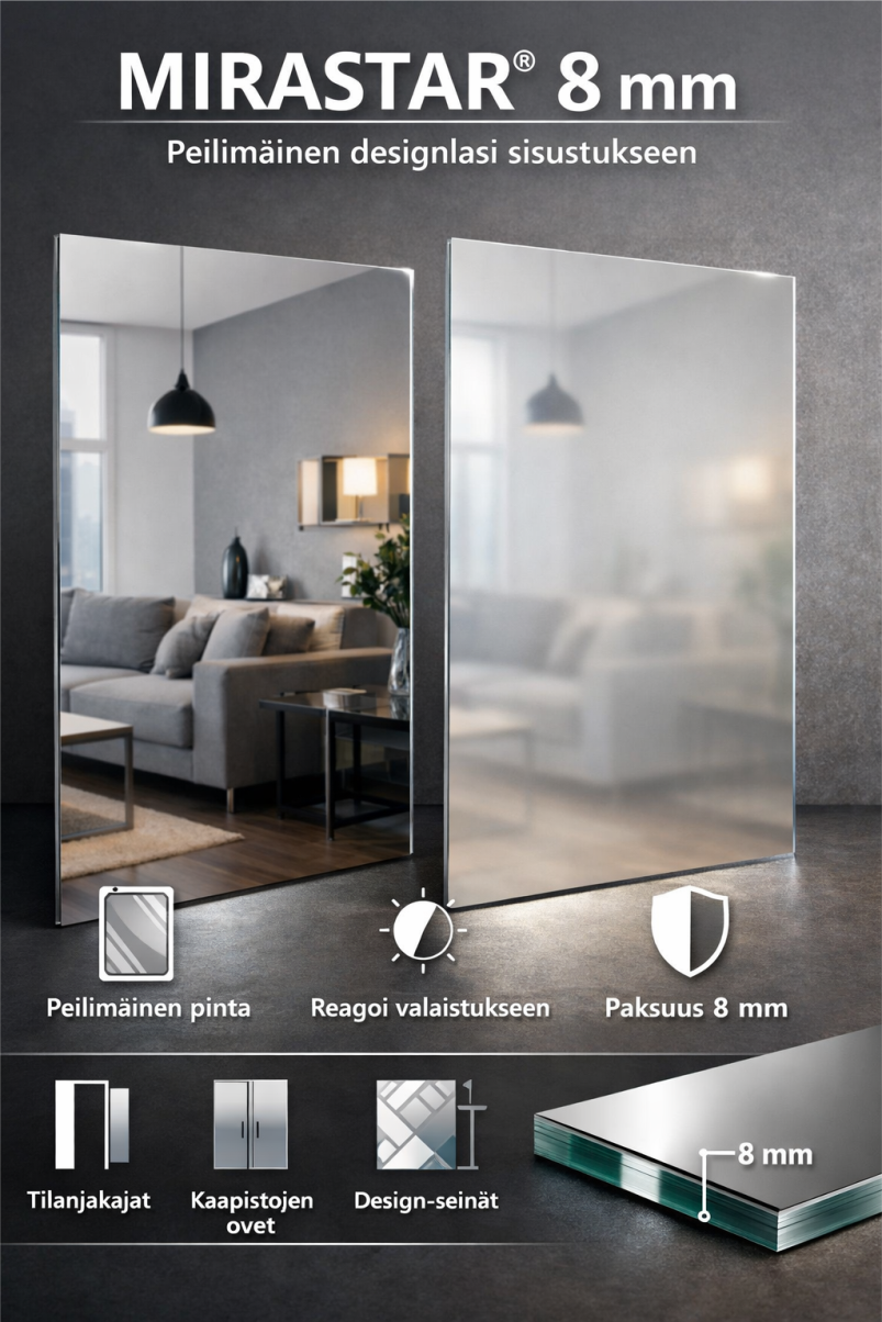8 mm paksuus tekee MIRASTAR®-lasista jämäkän ja laadukkaan tuntuisen. Se soveltuu erinomaisesti sisätiloihin, joissa halutaan yhdistää peilimäinen heijastus, avaruuden tuntu ja design-henkinen ilme.
